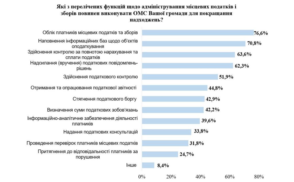 На думку органів місцевого самоврядування, облік платників місцевих податків і зборів та наповнення інформаційних баз про об’єкти та суб’єктів оподаткування є найбільш актуальними питаннями з точки зору покращення якості надходжень. Окрім цього, понад половина опитаних вважають, що органи місцевого самоврядування повинні мати достатньо повноважень для здійснення контролю за нарахуваннями і сплатою місцевих податків і зборів, здійснювати розсилку податкових повідомлень та мати можливість податкового контролю щодо місцевих податків і зборів.