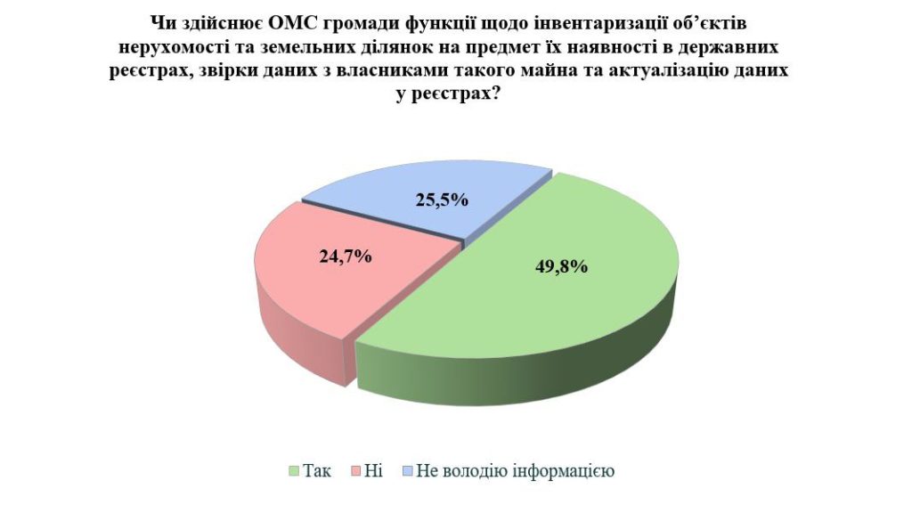 На питання: «Чи здійснює ОМС вашої громади функції щодо інвентаризації об’єктів нерухомості та земельних ділянок на предмет їх наявності в державних реєстрах, звірки даних з власниками такого майна та актуалізацію даних у реєстрах?» майже половина опитаних (49,8%) зазначили, що здійснюють інвентаризацію об’єктів нерухомості та земельних ділянок на предмет їх наявності державних реєстрах, здійснюють звірку даних з власниками майна та актуалізацію даних у реєстрах. Відповідно, інша частина органів місцевого самоврядування не здійснює зазначених дій, що, ймовірно, може негативно впливати на стан надходжень місцевих податків до бюджетів громад.