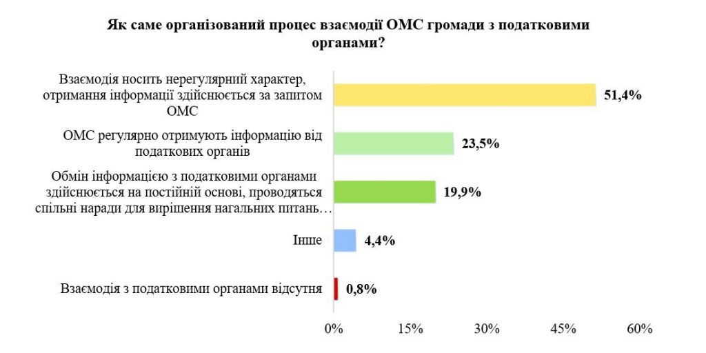 Найпоширенішою формою взаємодії вказується отримання інформації на запити органів місцевого самоврядування (51,4%), на постійній основі отримує інформацію від податкових органів 23,5% опитаних, про наявність тісної співпраці зазначає 19,9% респондентів.