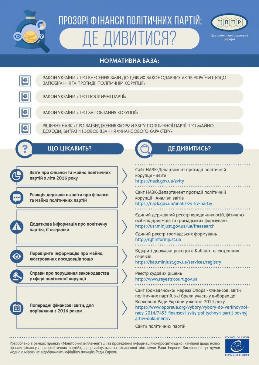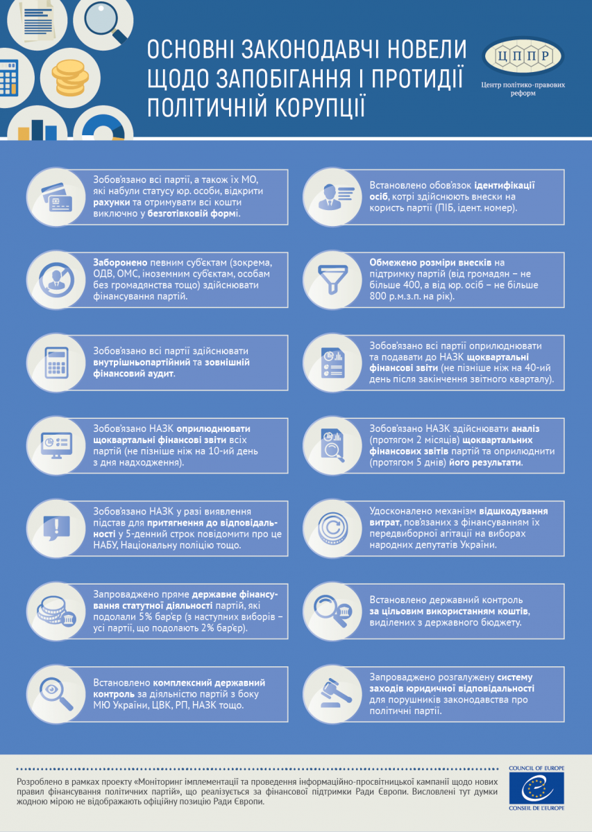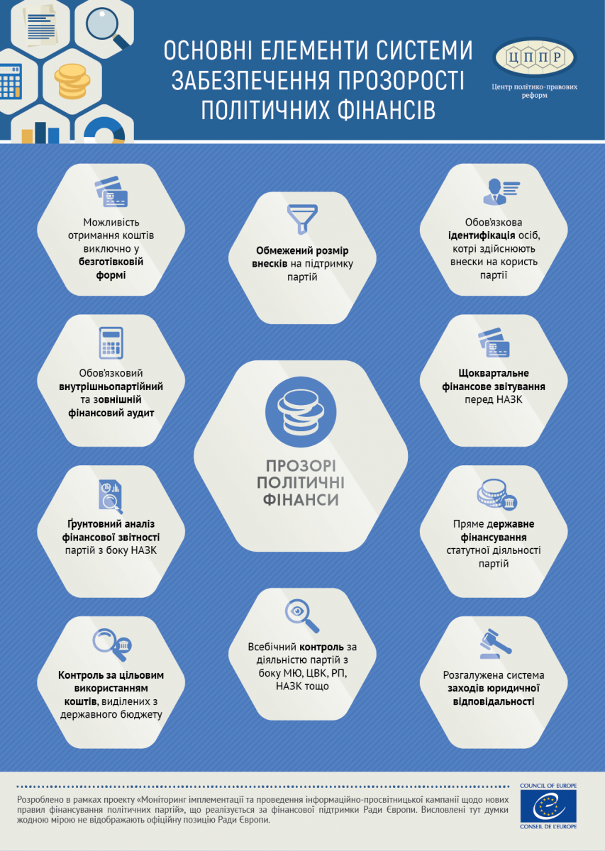 Інфографіки розроблені в рамках проекту «Моніторинг імплементації та проведення інформаційно-просвітницької кампанії щодо нових правил фінансування політичних партій», що реалізується за фінансової підтримки Ради Європи. Висловлені тут думки жодною мірою не відображають офіційну позицію Ради Європи.