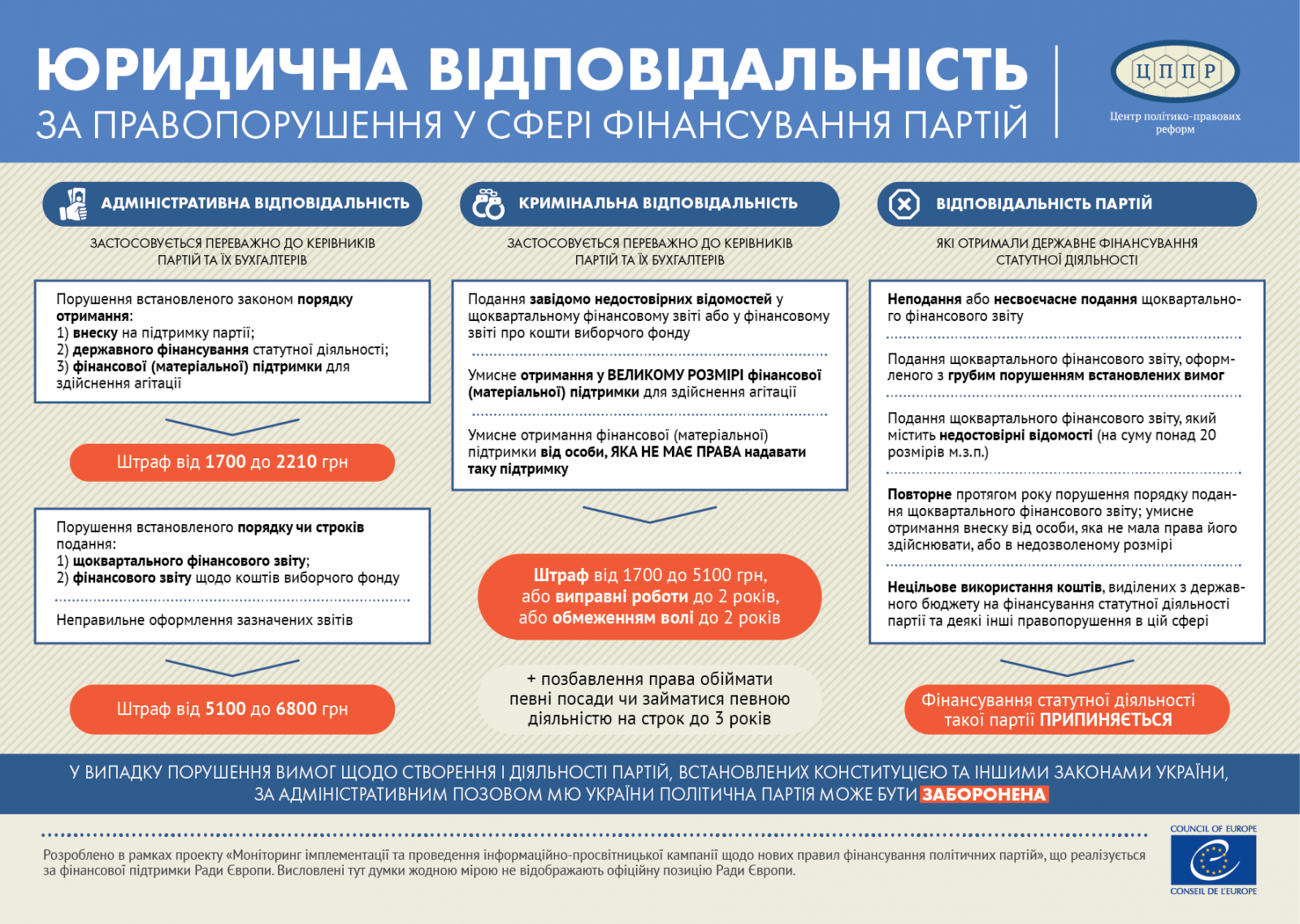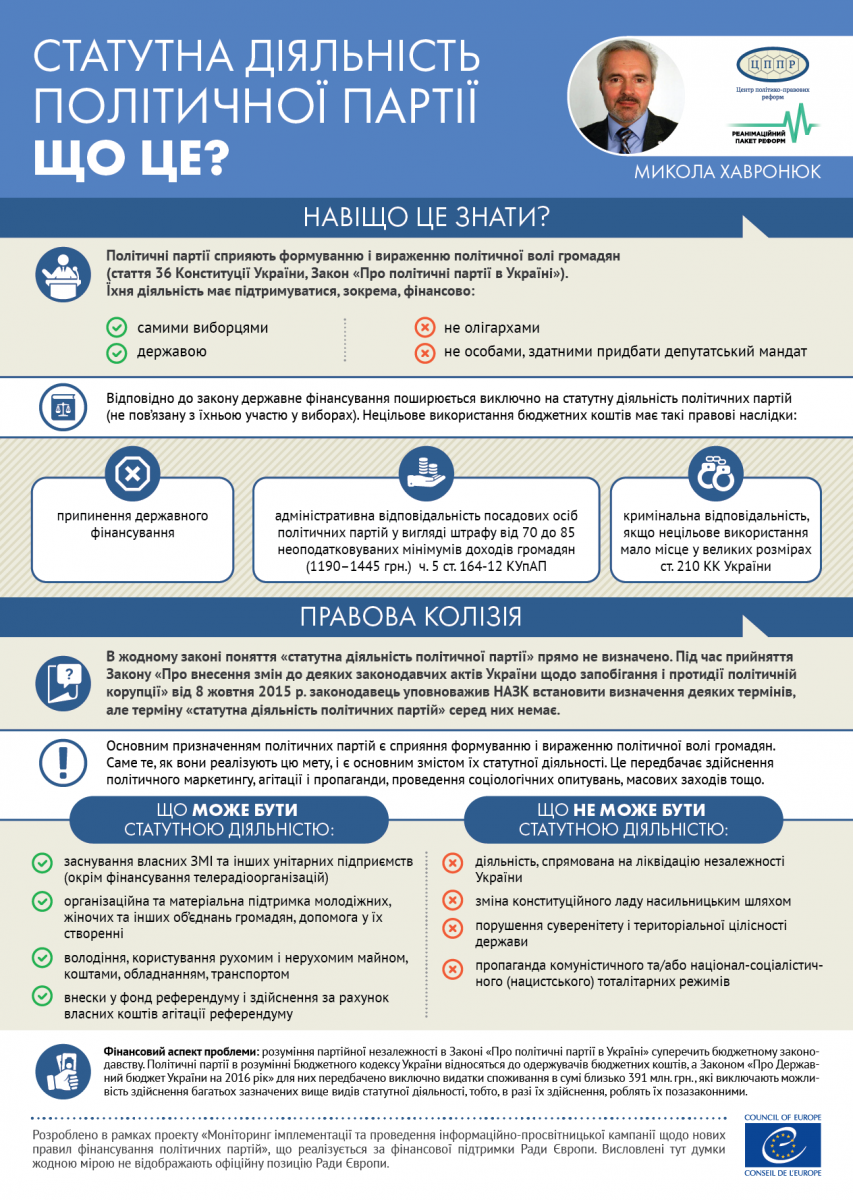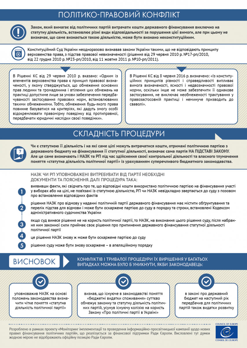 Інфографіки розроблені в рамках проекту «Моніторинг імплементації та проведення інформаційно-просвітницької кампанії щодо нових правил фінансування політичних партій», що реалізується за фінансової підтримки Ради Європи. Висловлені тут думки жодною мірою не відображають офіційну позицію Ради Європи.