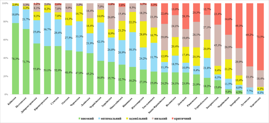 За результатами оцінювання фінансової спроможності, 182 територіальних громад (або 12,7% від загальної кількості) мають критичний рівень спроможності, 247 (17,2%) – низький. Тобто, 429 громад (29,8%) належать до найнижчих категорій спроможності. Критичний рівень зафіксовано серед громад 16 областей. Об’єктивно, що значна кількість територіальних громад мають низьку фінансову спроможність з огляду на воєнні дії, що відбуваються на їхніх територіях та на територіях, які є близькими до зони бойових дій. Водночас, немала кількість громад, які за оцінками віднесено до критичного рівня спроможності, знаходяться на територіях, які є віддаленими від зони активних бойових дій. Зокрема, у Херсонській області налічується 36 громад з критичним рівнем спроможності, у Запорізькій – 33, у Луганській – 18, Донецькій – 13. Водночас, у Чернівецькій області 18 територіальних громад також належать до критичного рівня фінансової спроможності, у Закарпатській – 15, Івано-Франківській – 14, Рівненській – 13.