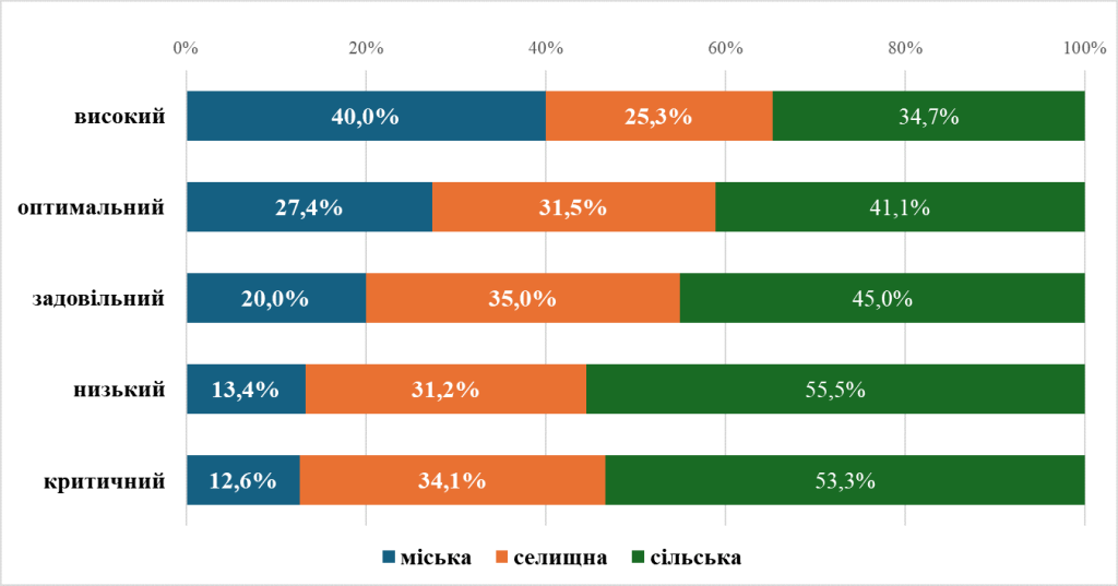 Слід звернути увагу, що за підсумками проведеного оцінювання встановлено, що існує залежність між сформованими рівнями спроможності територіальних громад і категоріями населених пунктів. Нагадаємо, що відповідно до прийнятого Верховною Радою України Закону №3285 від 28.07.2023 в Україні ліквідовано радянський принцип формування адміністративного-територіального устрою, натомість встановлено чіткі процедури та критерії віднесення населених пунктів до категорії міст, селищ та сіл. Відповідно до проведеного оцінювання, із 495 громад, що належать до високого рівня спроможності 198 (або 40%) мають статус міських, 125 (25,3%) – селищні громади, 172 (34,7%) – сільські громади. По мірі зниження рівня спроможності (від високого до критичного) частка територіальних громад міського типу зменшується, водночас кількість селищних та сільських громад зростає. Серед 182 громад, які віднесено до критичного рівня лише 23 (12,6%) міські громади, 62 (34,1%) – селищні, 97 (53,3%) – сільські громади.