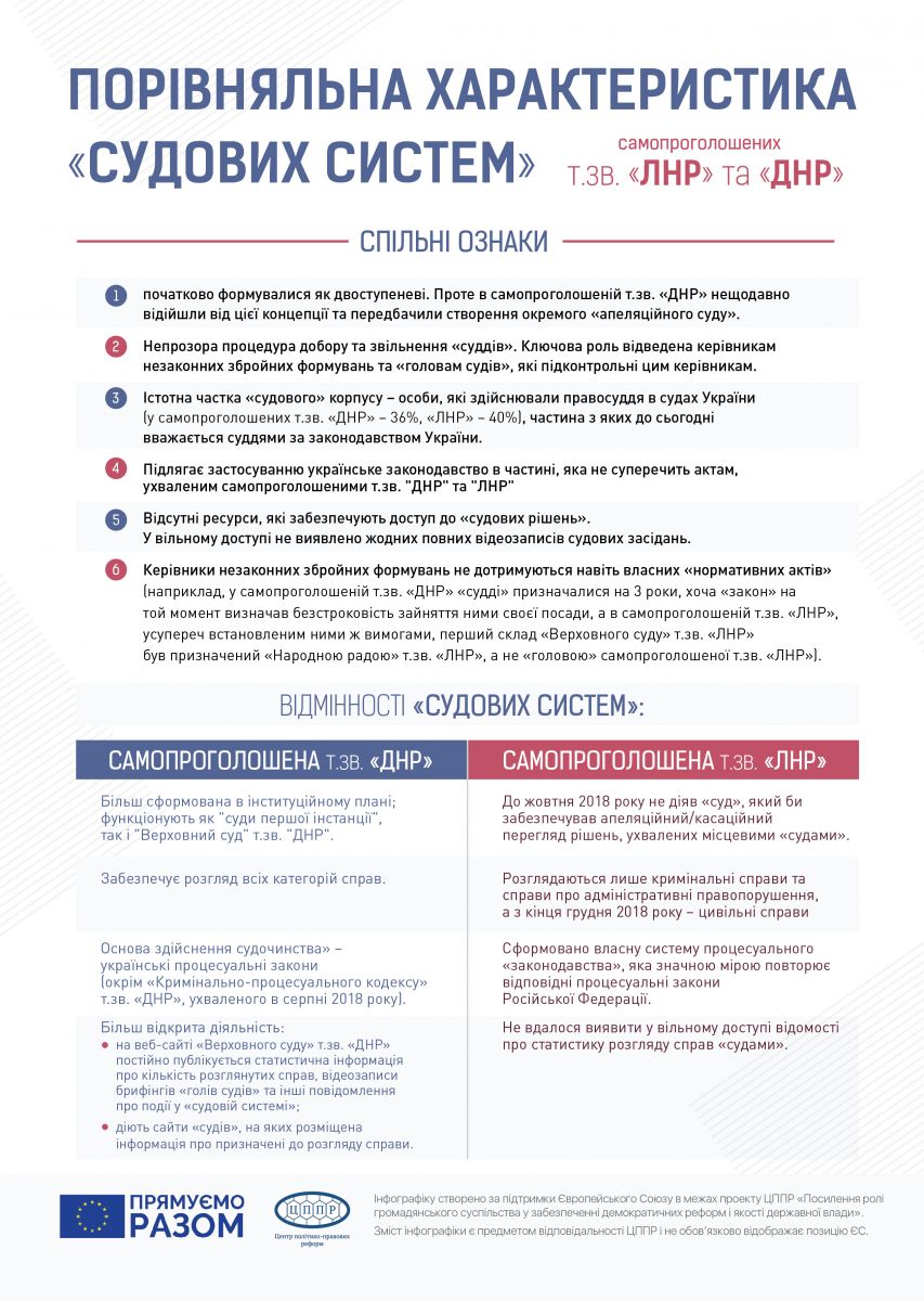 «Судова система» у самопроголошеній т.зв. «ДНР» краще сформована в інституційному плані: у самопроголошеній т.зв. «ЛНР» до жовтня 2018 року не діяв суд, який би забезпечував апеляційний та касаційний перегляд рішень, ухвалених місцевими судами.