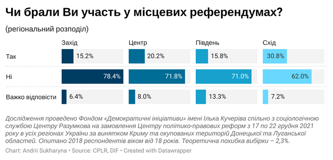 21% респондентів заявили, що брали участь у місцевих референдумах. Найвища частка таких людей на Сході – близько 30%. Загалом, можна припустити, що частина респондентів неправильно ідентифікували певні активності, як місцевий референдум. Вища частка мешканців Сходу, які заявили про те, що брали участь у місцевому референдумі може свідчити про участь частини людей у опитуваннях, які проводились на фоні військового конфлікту в 2014 році.