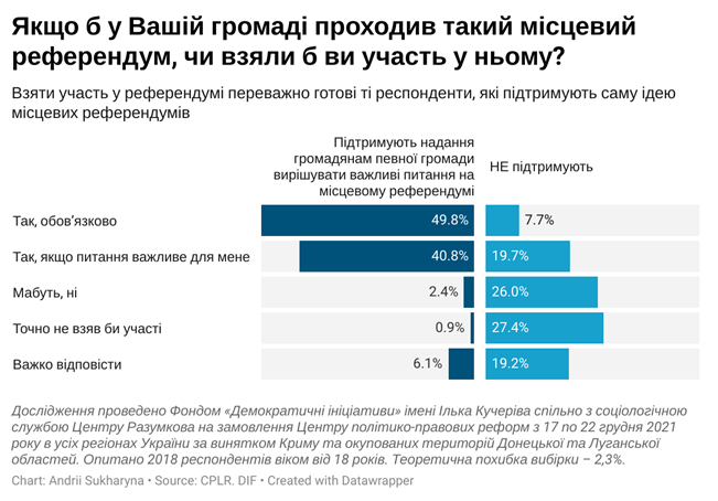 Третина опитаних заявили, що точно взяли би участь у проведенні такого місцевого референдуму, а ще трохи більше третини, що взяли би участь за умови, якщо питання, яке вирішуватиметься, буде важливим для них особисто. Взяти участь у референдумі переважно готові ті респонденти, які підтримують саму ідею місцевих референдумів. Так, серед цієї когорти людей обов’язково взяли участь у референдумі майже 50%, а ще 41%, якщо питання буде важливим для них особисто.