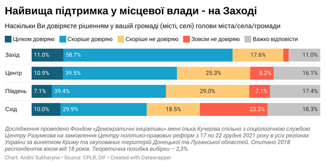 Місцева влада, традиційно, має відносно непоганий баланс довіри населення, особливо порівняно з аналогічними опитуваннями щодо органів центральної влади. Так, 52% респондентів довіряють чи скоріше довіряють голові громади, 47% довіряють місцевій раді, 39,5% – виконавчому комітету місцевої ради. Якщо розглядати регіональний аспект, то помітно, що найбільше місцевій владі довіряють на Заході країни. Стосовно місцевого референдуму, то йому довіряють 36%, але варто відмітити велику частку невизначених – 38%.