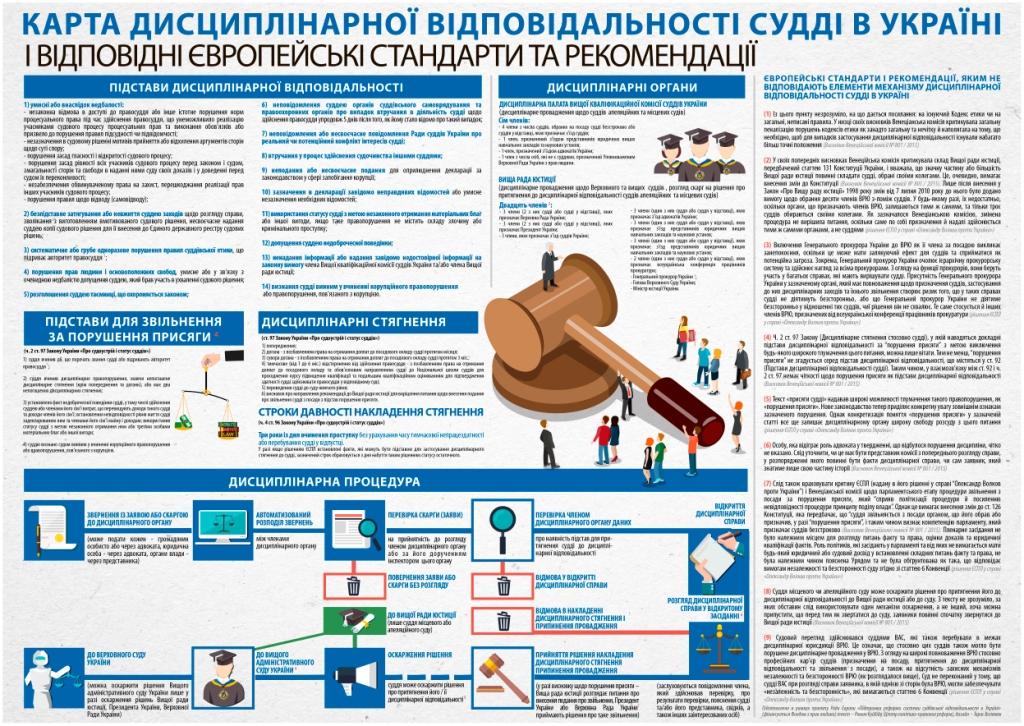 У рамках проекту Ради Європи «Підтримка реформи системи суддівської відповідальності в Україні» наші експерти підготували карту дисциплінарної відповідальності судді, яка показує за що, хто і як може притягнути суддю до дисциплінарної відповідальності, а також ахілесові п’яти цієї системи. Подивитися інфографіку